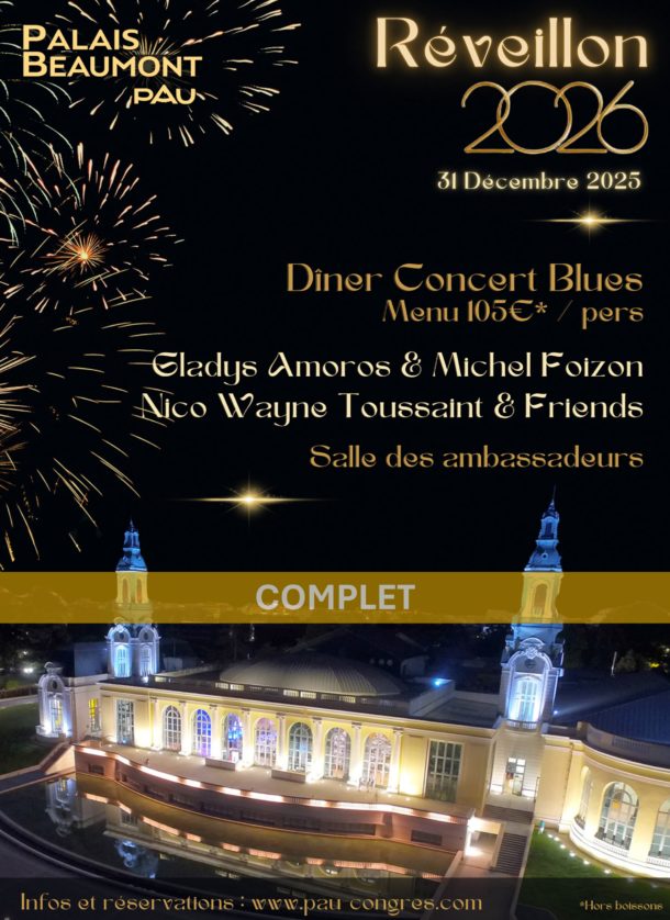 Pour cet événement » REVEILLON BLUES « du 31 décembre 2025 dans la grande Salle des Ambassadeurs du Palais Beaumont de PAU, c’est en Sextet qu’ils se produiront avec, en guests, les très charismatiques Nico Wayne TOUSSAINT à l’harmonica et Sylvain TEJERIZO au saxophone tenor, entourés de Rémi GRANGE à la contrebasse et Julien FEUGAS à la batterie.